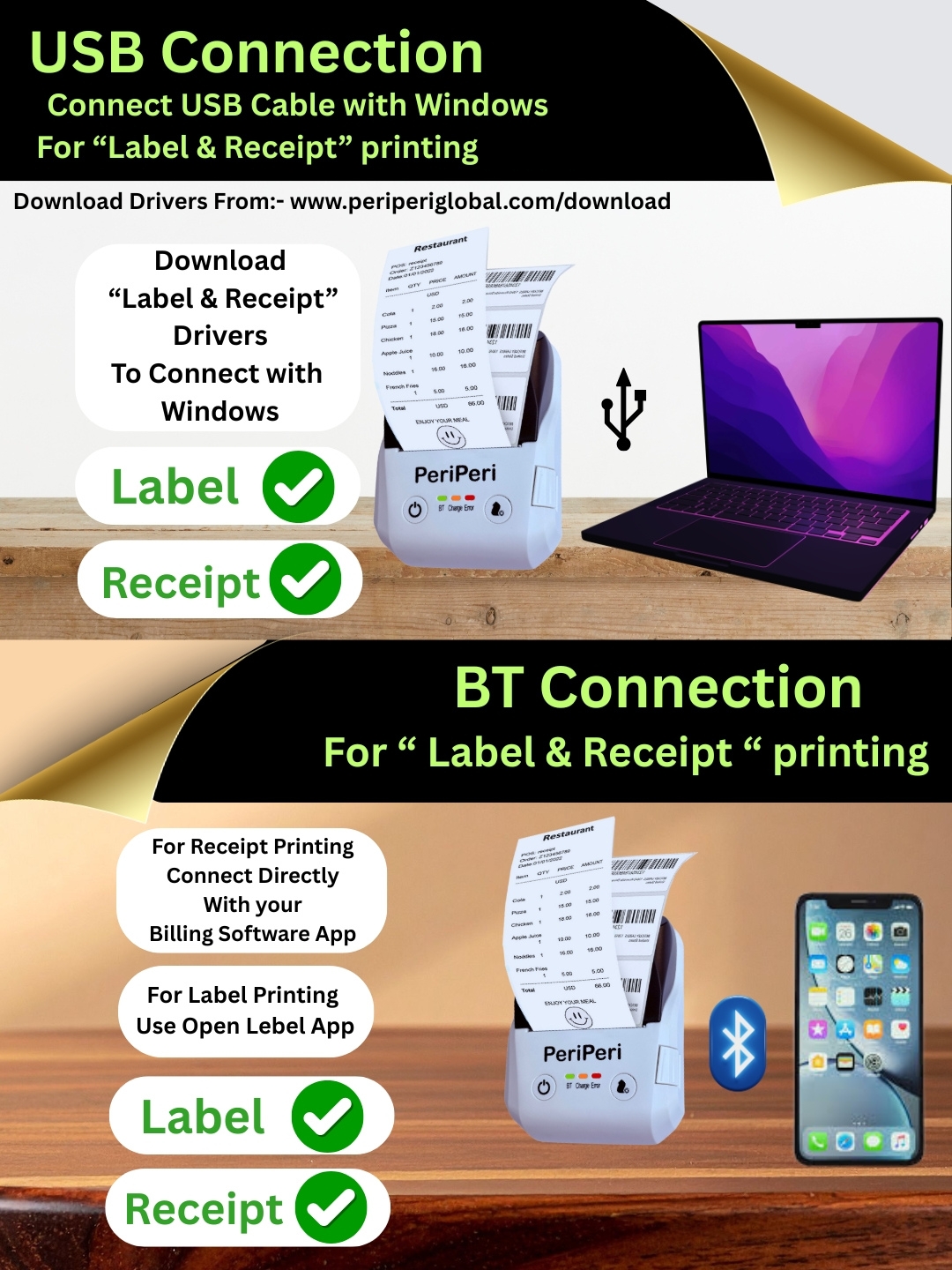 - 50-90mm/s print speed, 203dpi Resolution. Support BT And USB Cable Connection, Compatible With iOS, Android & Windows System. NOTE: With Windows System Work In Receipt Mode With USB Cable Only
